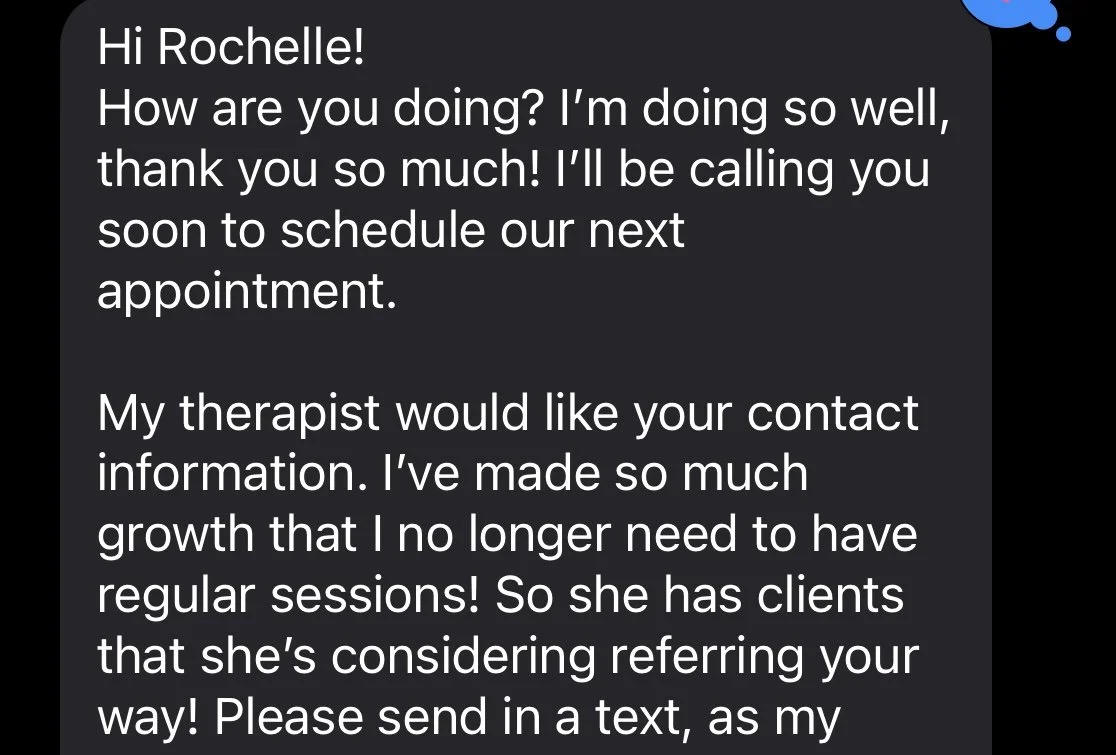 “I had the luck of meeting Rochelle a few months ago. Immediately I knew I’d come across a special being. She was warm, welcoming, non - judgmental , calm and wise. At our first encounter, although I felt slightly nervous about digging in deep and doing real spiritual work, Rochelle helped me overcome my anxiety and approach my journey with a gentle ease and playfulness. She is always professional and genuinely involved in helping me attain my goals. Through our Sessions of Hypnotherapy, she serves as a sort of life-coach and spiritual guide. She is grounded, anchoring, trustworthy, and dependable. I feel safe working with Rochelle because I know she operates out of love and light. I can’t imagine having a better support in my corner!
